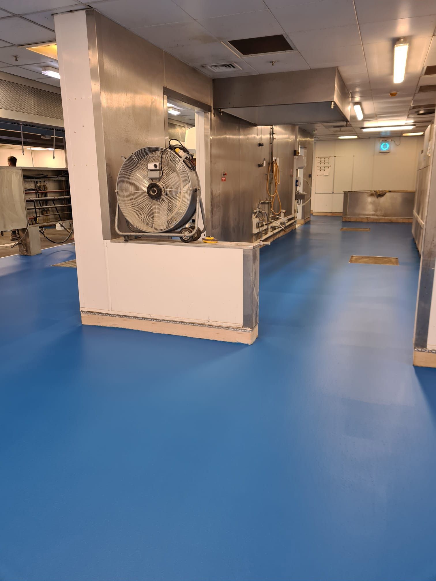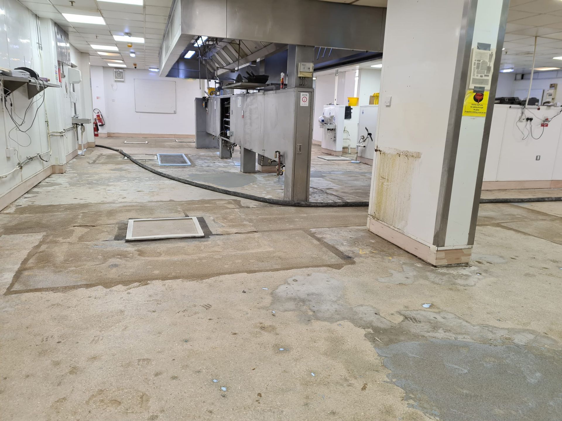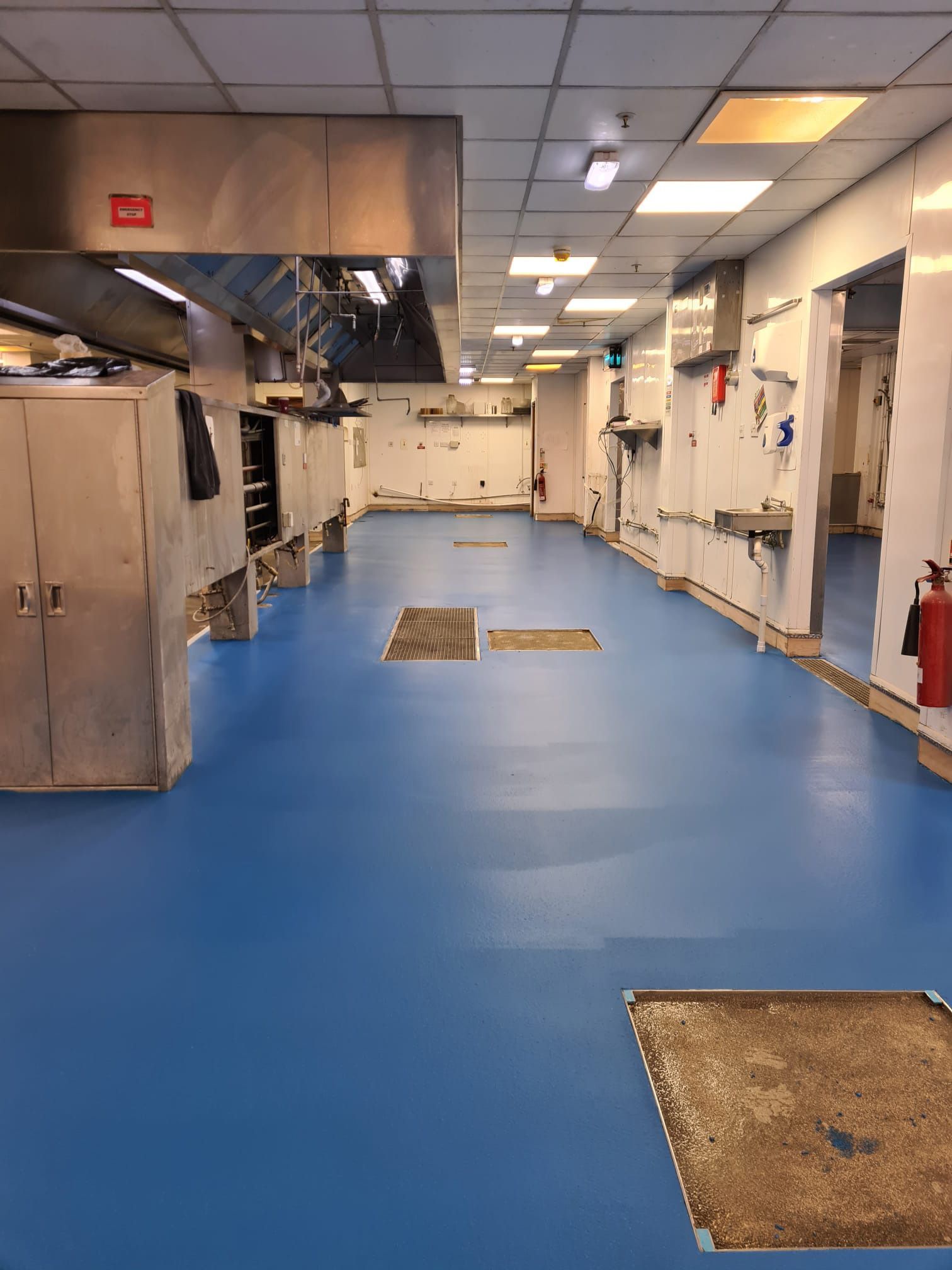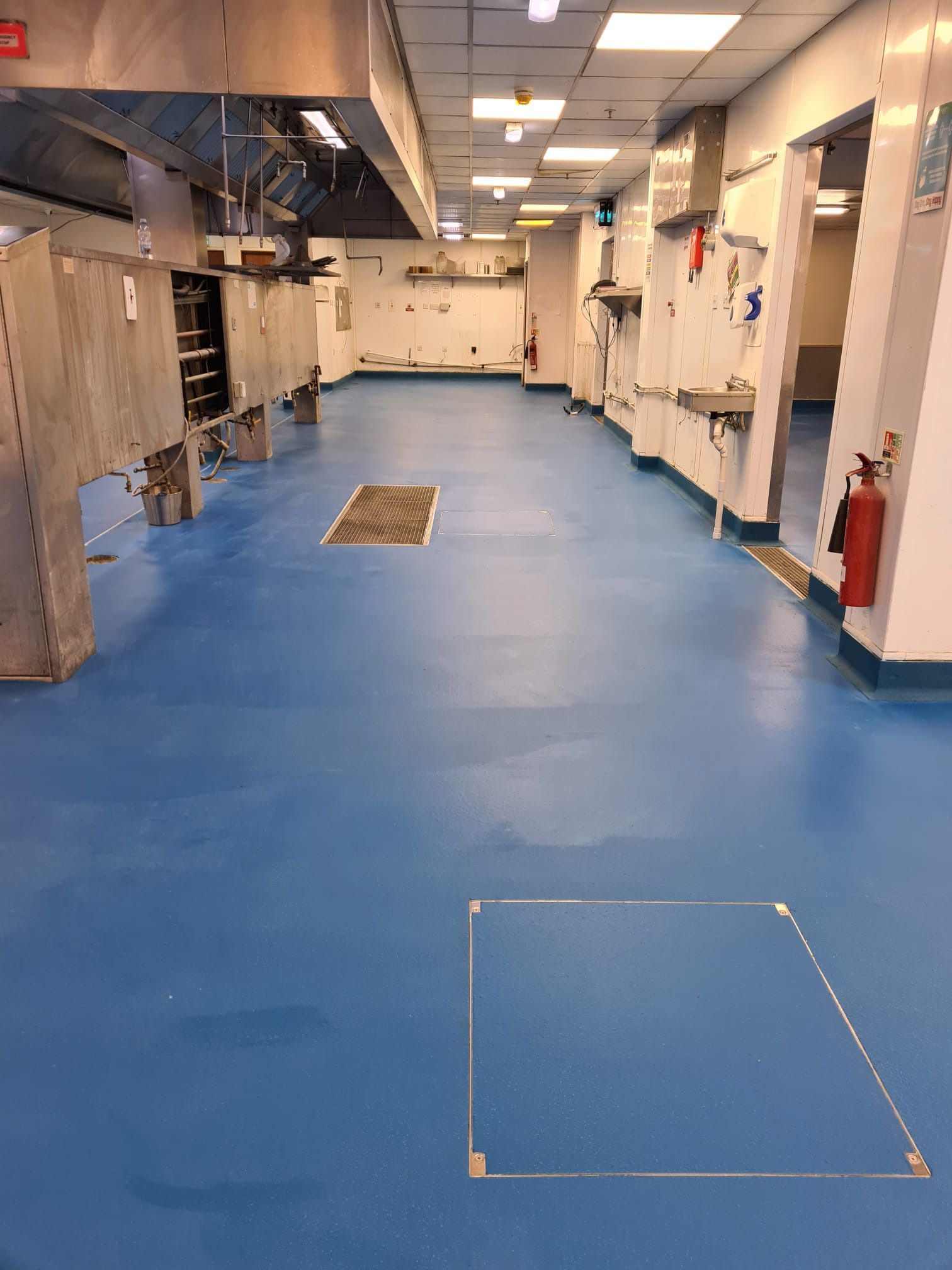This is a job in a commercial kitchen in a big hotel by Southampton docs. Complete take out of existing old floors and cove edgings. Replacement floor is polyurethane HF 6MM.